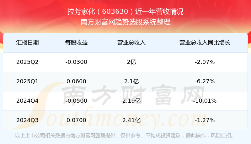 拉芳家化2025年第二季度財報顯示,公司主營收入2億元,同比-2.07%;歸母凈利潤-668.75萬元,同比-172.38%;扣非凈利潤-951.98萬元,同比-215.19%;
