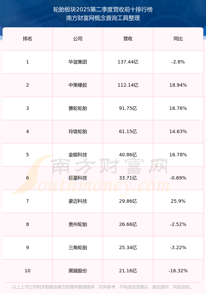 按照南方財富網概念查詢工具統(tǒng)計,該股所屬板塊為輪胎板塊,該板塊共有28只股票,通用股份2025第二季度營收在該板塊中排名為第15名,該板塊2025第二季度營收排名前十的股票如下表:
