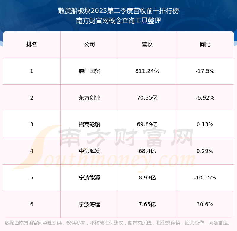 按照南方財(cái)富網(wǎng)概念查詢工具統(tǒng)計(jì),該股所屬板塊為散貨船板塊,該板塊共有6只股票,中船防務(wù)2025第二季度營(yíng)收在該板塊中排名為第6名,該板塊2025第二季度營(yíng)收排名前十的股票如下表: