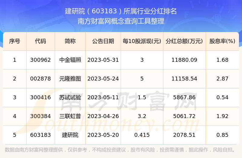 按照南方財富網(wǎng)趨勢選股系統(tǒng)統(tǒng)計,建研院所屬行業(yè)為專業(yè)服務(wù)行業(yè),專業(yè)服務(wù)行業(yè)分紅排名情況如下表: