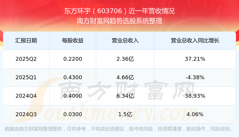 東方環(huán)宇2025年第二季度顯示,公司主營收入2.36億元,同比37.21%;歸母凈利潤4240.69萬元,同比0.37%;扣非凈利潤3759.83萬元,同比1.59%。
