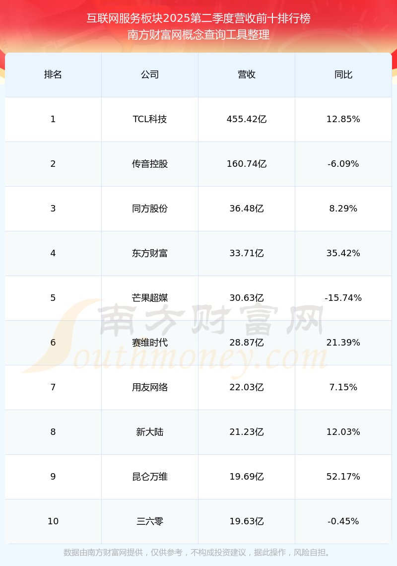 按照南方財(cái)富網(wǎng)概念查詢工具統(tǒng)計(jì),該股所屬板塊為互聯(lián)網(wǎng)服務(wù)板塊,該板塊共有52只股票,浩瀚深度2025第二季度營(yíng)收在該板塊中排名為第44名,該板塊2025第二季度營(yíng)收排名前十的股票如下表: