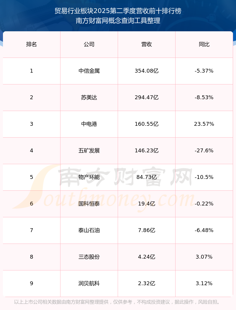 按照南方財富網(wǎng)概念查詢工具統(tǒng)計,該股所屬板塊為貿(mào)易行業(yè)板塊,該板塊共有9只股票,遼寧成大2025第二季度營收在該板塊中排名為第9名,該板塊2025第二季度營收排名前十的股票如下表: