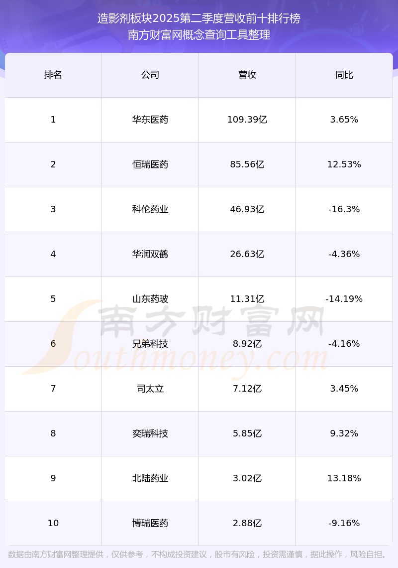按照南方財(cái)富網(wǎng)概念查詢(xún)工具統(tǒng)計(jì),該股所屬板塊為造影劑板塊,該板塊共有14只股票,恒瑞醫(yī)藥2025第二季度營(yíng)收在該板塊中排名為第2名,該板塊2025第二季度營(yíng)收排名前十的股票如下表:
