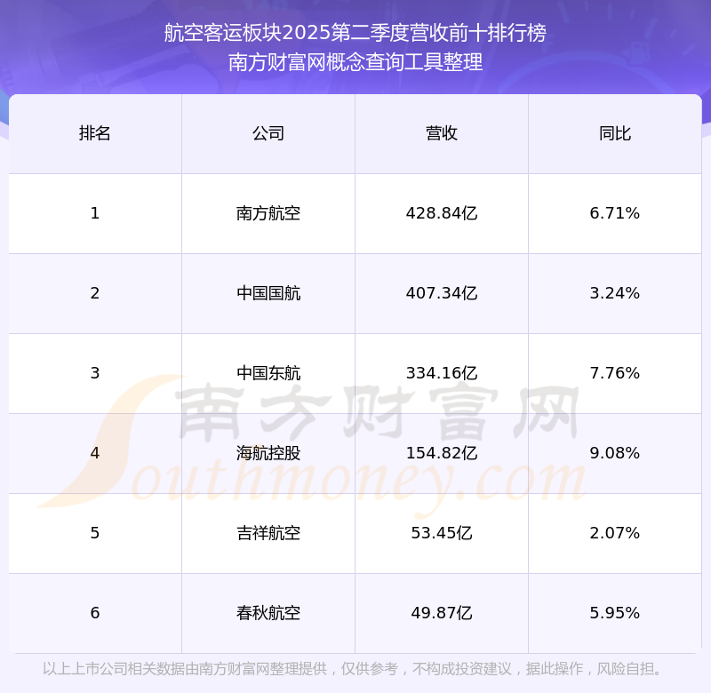 按照南方財(cái)富網(wǎng)概念查詢工具統(tǒng)計(jì),該股所屬板塊為航空客運(yùn)板塊,該板塊共有6只股票,春秋航空2025第二季度營(yíng)收在該板塊中排名為第6名,該板塊2025第二季度營(yíng)收排名前十的股票如下表: