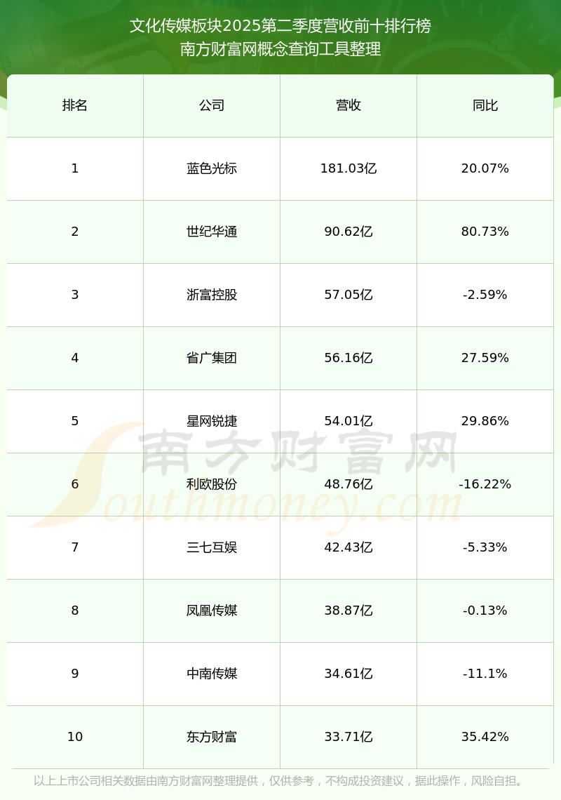 按照南方財富網(wǎng)概念查詢工具統(tǒng)計,該股所屬板塊為文化傳媒板塊,該板塊共有240只股票,新華傳媒2025第二季度營收在該板塊中排名為第100名,該板塊2025第二季度營收排名前十的股票如下表: