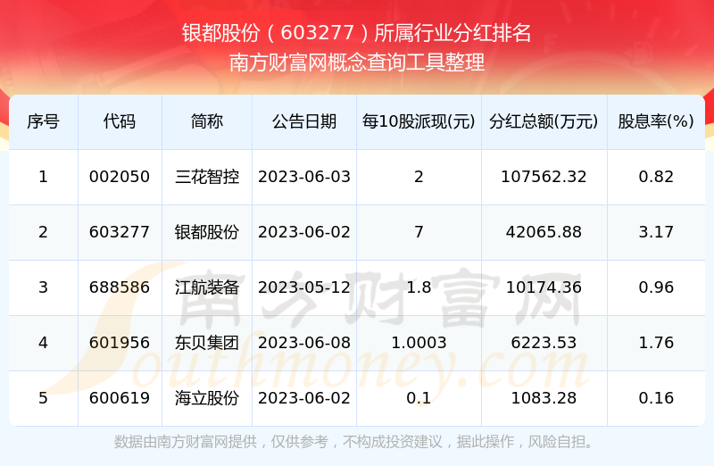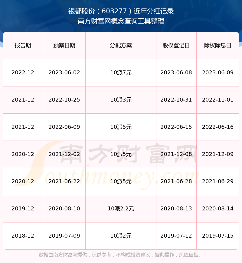 銀都股份最新一次公布的分紅方案為10派7元。本次權(quán)益分派股權(quán)登記日為2023年6月8日,除權(quán)除息日為2023年6月9日,派息日為2023年6月9日。