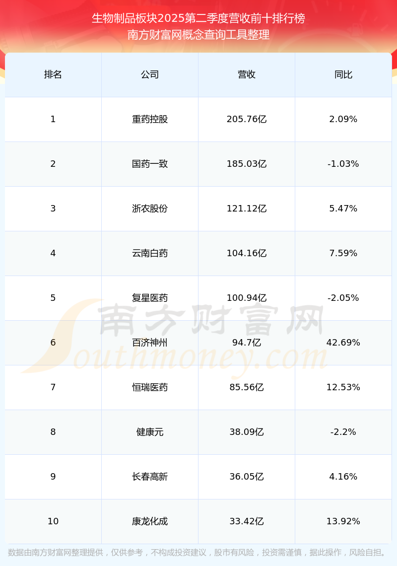 按照南方財(cái)富網(wǎng)概念查詢工具統(tǒng)計(jì),該股所屬板塊為生物制品板塊,該板塊共有148只股票,益方生物2025第二季度營(yíng)收在該板塊中排名為第145名,該板塊2025第二季度營(yíng)收排名前十的股票如下表: