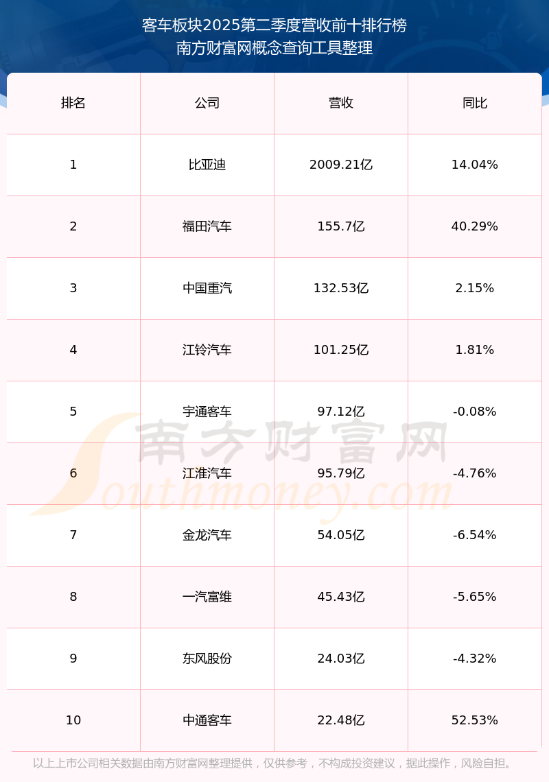 按照南方財(cái)富網(wǎng)概念查詢工具統(tǒng)計(jì),該股所屬板塊為客車板塊,該板塊共有13只股票,宇通客車2025第二季度營(yíng)收在該板塊中排名為第5名,該板塊2025第二季度營(yíng)收排名前十的股票如下表: