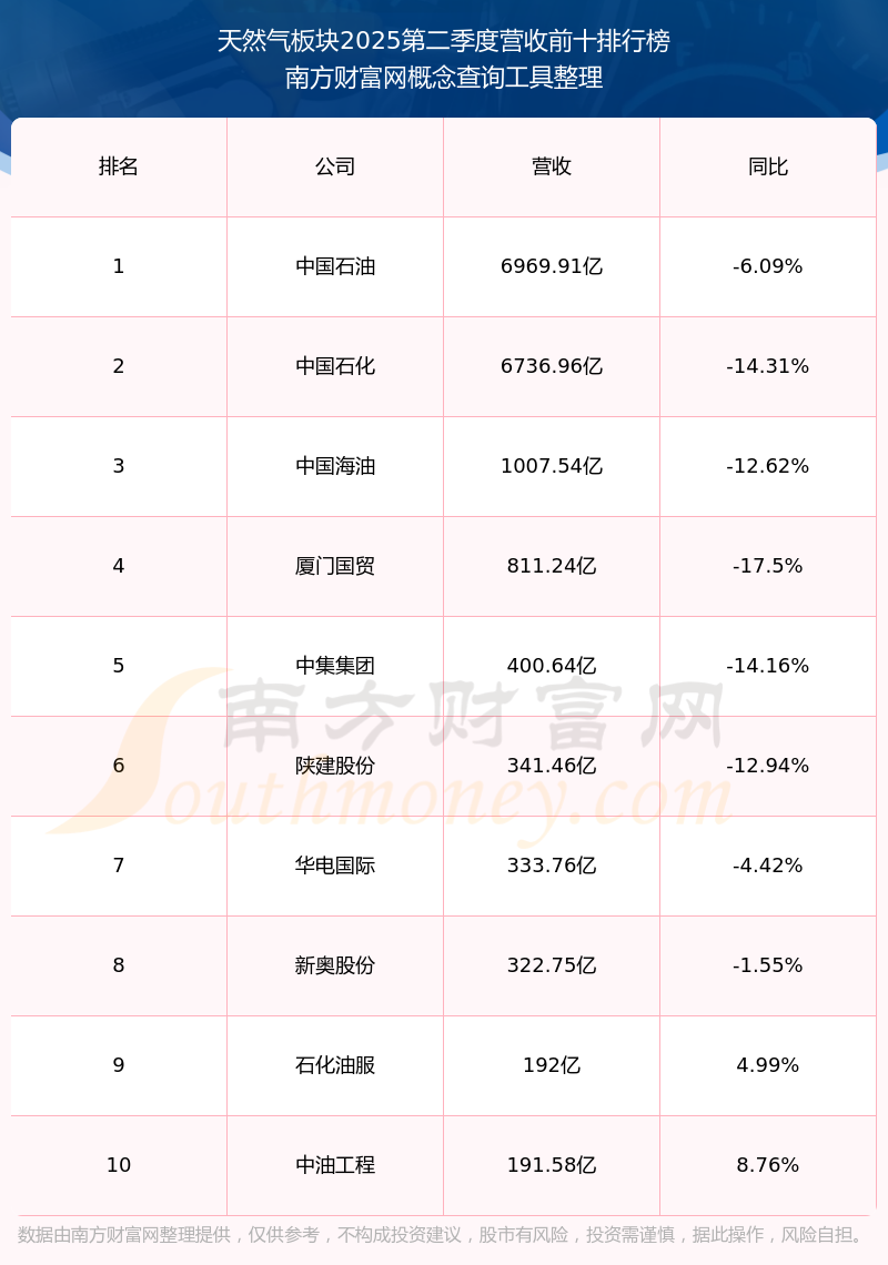按照南方財(cái)富網(wǎng)概念查詢工具統(tǒng)計(jì),該股所屬板塊為天然氣板塊,該板塊共有154只股票,藍(lán)天燃?xì)?025第二季度營收在該板塊中排名為第79名,該板塊2025第二季度營收排名前十的股票如下表: