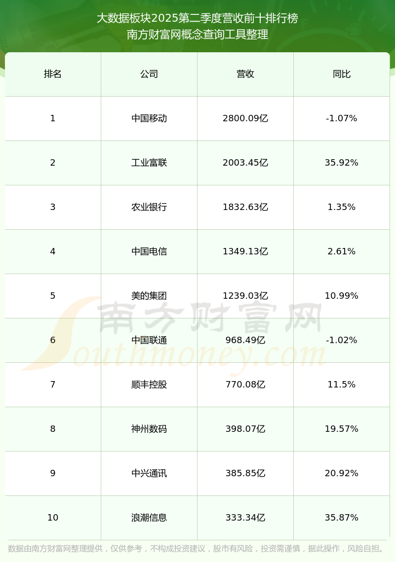 按照南方財富網(wǎng)概念查詢工具統(tǒng)計,該股所屬板塊為大數(shù)據(jù)板塊,該板塊共有430只股票,中通國脈2025第二季度營收在該板塊中排名為第364名,該板塊2025第二季度營收排名前十的股票如下表: