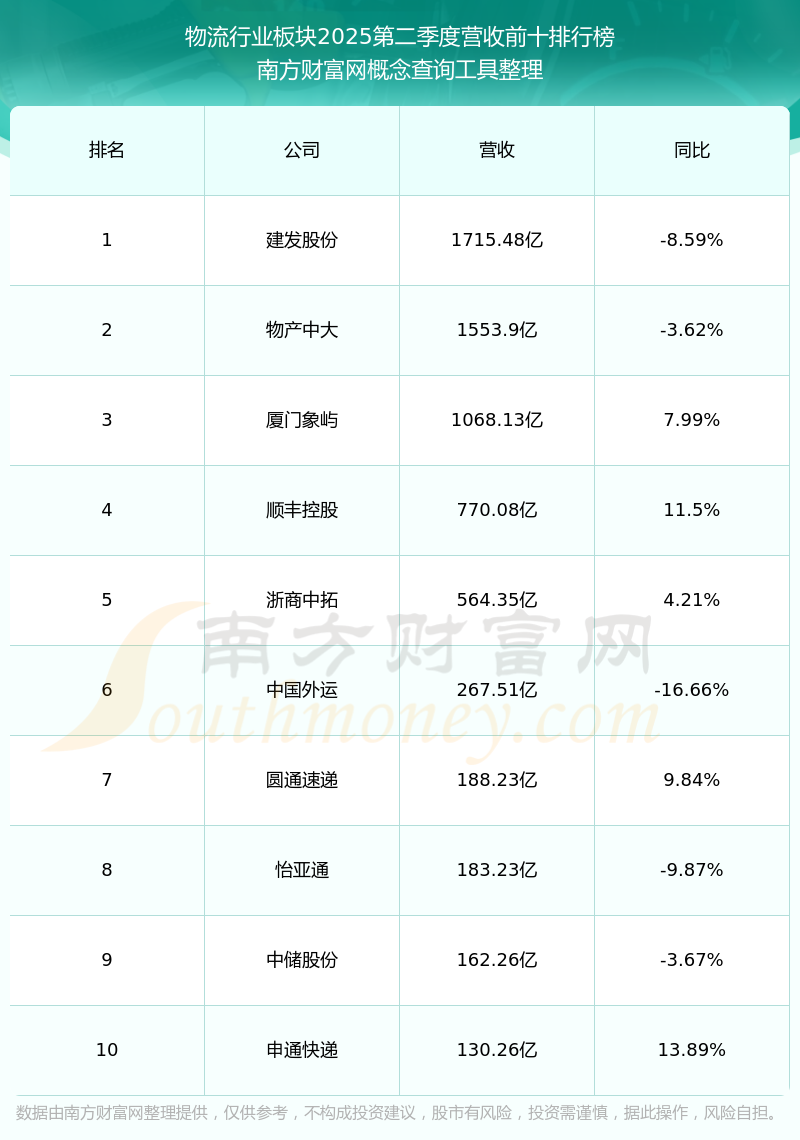 按照南方財富網(wǎng)概念查詢工具統(tǒng)計,該股所屬板塊為物流行業(yè)板塊,該板塊共有57只股票,中創(chuàng)物流2025第二季度營收在該板塊中排名為第24名,該板塊2025第二季度營收排名前十的股票如下表:
