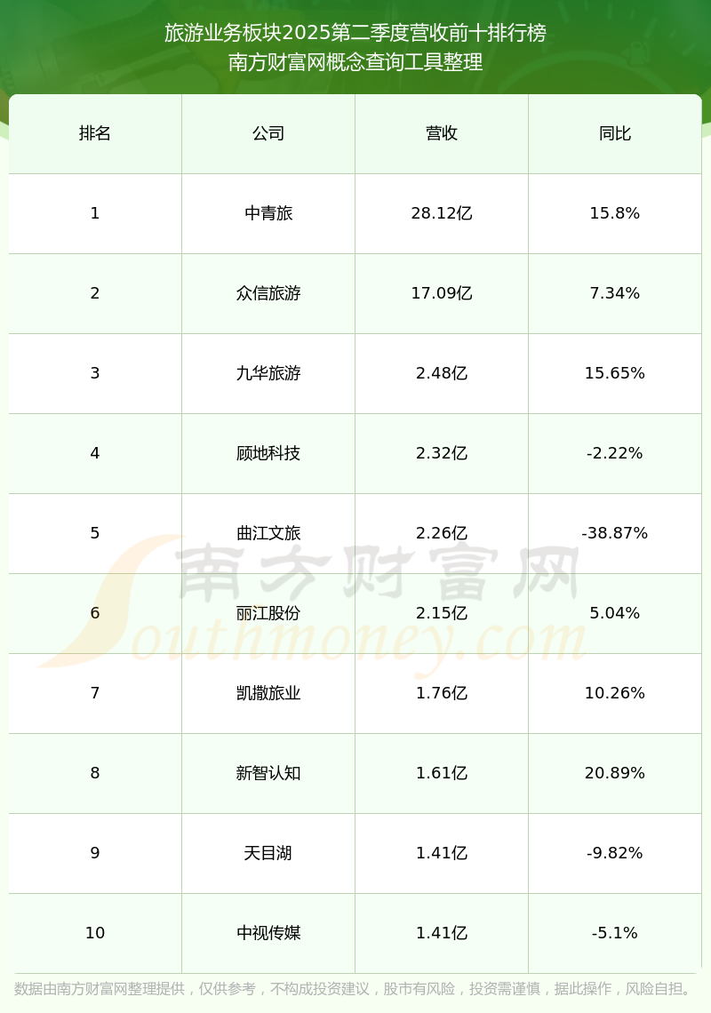 按照南方財富網(wǎng)概念查詢工具統(tǒng)計,該股所屬板塊為旅游業(yè)務板塊,該板塊共有14只股票,西藏旅游2025第二季度營收在該板塊中排名為第13名,該板塊2025第二季度營收排名前十的股票如下表: