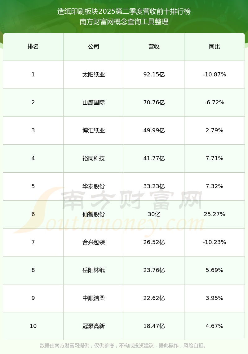 按照南方財富網(wǎng)概念查詢工具統(tǒng)計,該股所屬板塊為造紙印刷板塊,該板塊共有47只股票,宜賓紙業(yè)2025第二季度營收在該板塊中排名為第20名,該板塊2025第二季度營收排名前十的股票如下表: