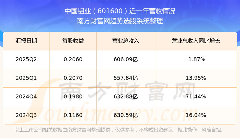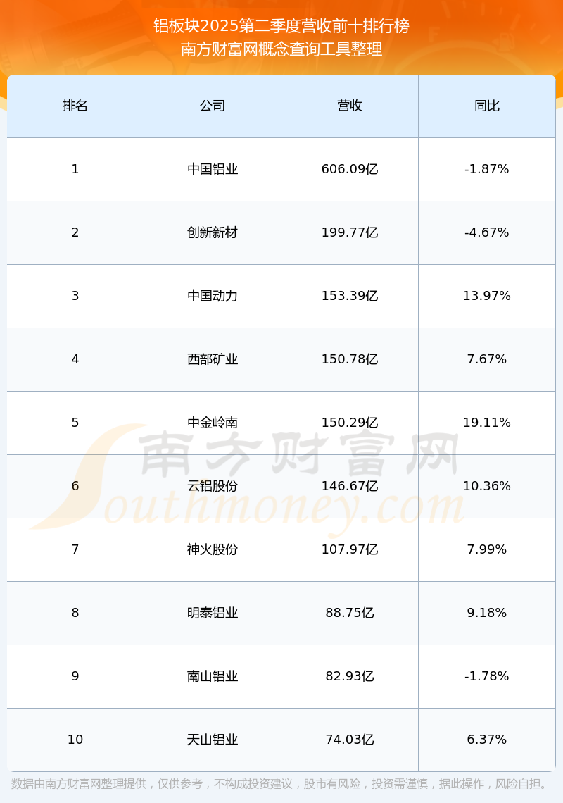 按照南方財(cái)富網(wǎng)概念查詢工具統(tǒng)計(jì),該股所屬板塊為鋁板塊,該板塊共有43只股票,中國(guó)鋁業(yè)2025第二季度營(yíng)收在該板塊中排名為第1名,該板塊2025第二季度營(yíng)收排名前十的股票如下表: