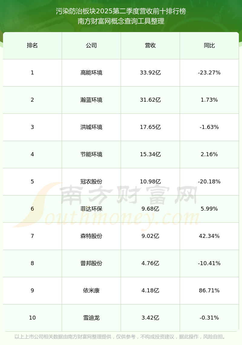 按照南方財(cái)富網(wǎng)概念查詢(xún)工具統(tǒng)計(jì),該股所屬板塊為污染防治板塊,該板塊共有19只股票,青達(dá)環(huán)保2025第二季度營(yíng)收在該板塊中排名為第19名,該板塊2025第二季度營(yíng)收排名前十的股票如下表: