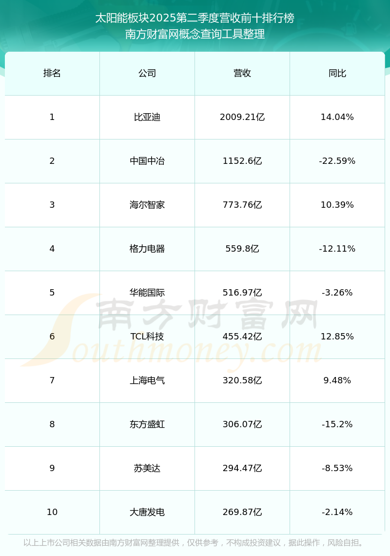 按照南方財(cái)富網(wǎng)概念查詢工具統(tǒng)計(jì),該股所屬板塊為太陽能板塊,該板塊共有448只股票,天域生物2025第二季度營收在該板塊中排名為第389名,該板塊2025第二季度營收排名前十的股票如下表: