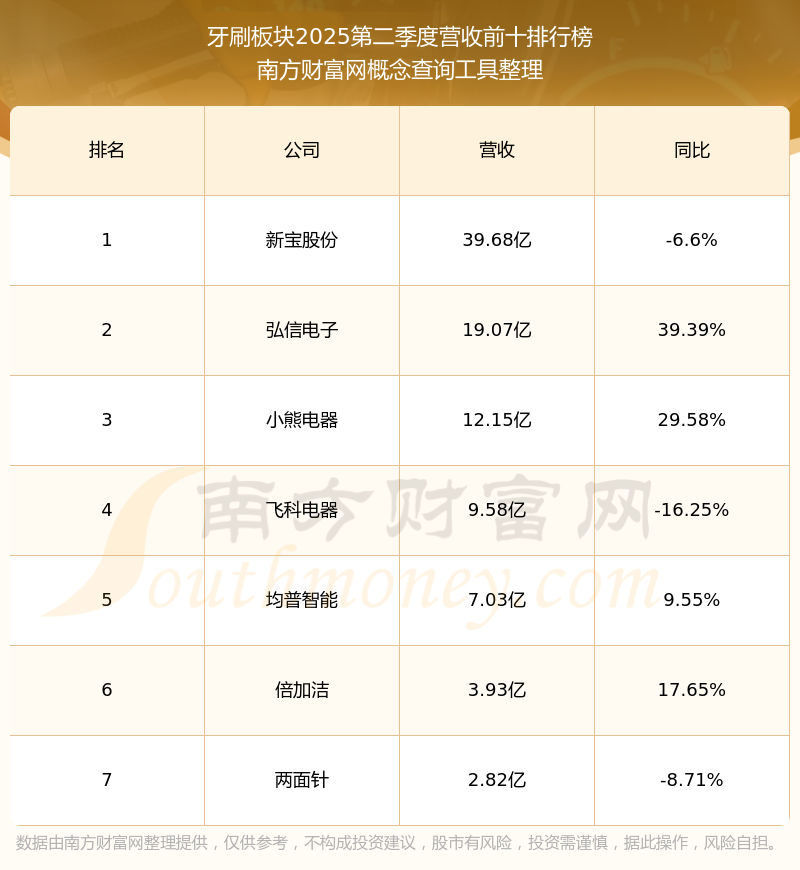 按照南方財富網(wǎng)概念查詢工具統(tǒng)計,該股所屬板塊為牙刷板塊,該板塊共有7只股票,倍加潔2025第二季度營收在該板塊中排名為第6名,該板塊2025第二季度營收排名前十的股票如下表: