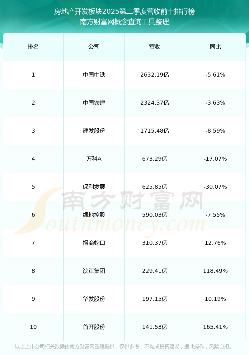 按照南方財(cái)富網(wǎng)概念查詢工具統(tǒng)計(jì),該股所屬板塊為房地產(chǎn)開發(fā)板塊,該板塊共有143只股票,格力地產(chǎn)2025第二季度營收在該板塊中排名為第59名,該板塊2025第二季度營收排名前十的股票如下表: