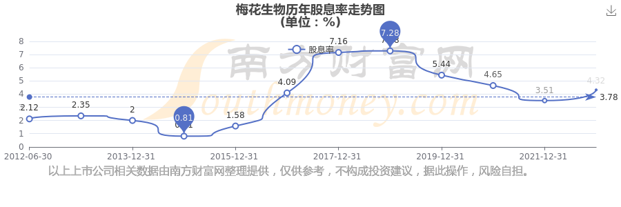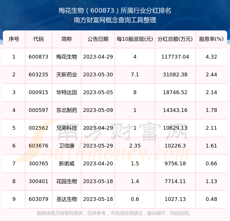 按照南方財富網(wǎng)趨勢選股系統(tǒng)統(tǒng)計,梅花生物所屬行業(yè)為氨基酸行業(yè),氨基酸行業(yè)分紅排名情況如下表: