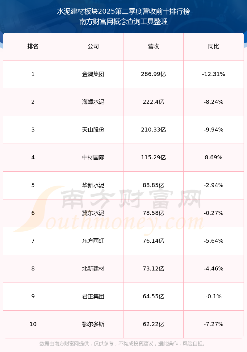 按照南方財(cái)富網(wǎng)概念查詢(xún)工具統(tǒng)計(jì),該股所屬板塊為水泥建材板塊,該板塊共有48只股票,寧波富達(dá)2025第二季度營(yíng)收在該板塊中排名為第35名,該板塊2025第二季度營(yíng)收排名前十的股票如下表: