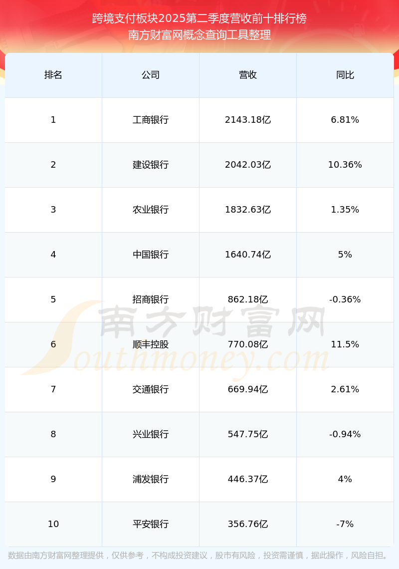 按照南方財富網(wǎng)概念查詢工具統(tǒng)計,該股所屬板塊為跨境支付板塊,該板塊共有88只股票,農(nóng)業(yè)銀行2025第二季度營收在該板塊中排名為第3名,該板塊2025第二季度營收排名前十的股票如下表: