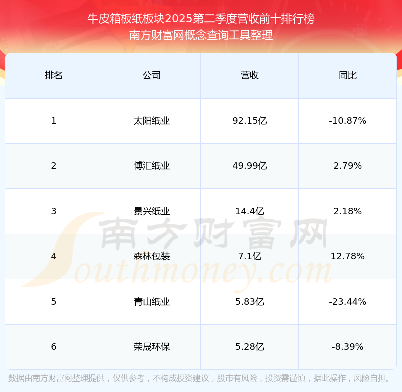 按照南方財富網(wǎng)概念查詢工具統(tǒng)計,該股所屬板塊為牛皮箱板紙板塊,該板塊共有6只股票,森林包裝2025第二季度營收在該板塊中排名為第4名,該板塊2025第二季度營收排名前十的股票如下表: