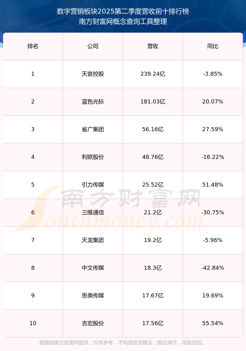 按照南方財(cái)富網(wǎng)概念查詢工具統(tǒng)計(jì),該股所屬板塊為數(shù)字營(yíng)銷板塊,該板塊共有66只股票,引力傳媒2025第二季度營(yíng)收在該板塊中排名為第5名,該板塊2025第二季度營(yíng)收排名前十的股票如下表: