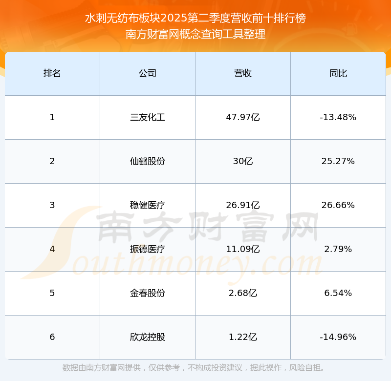 按照南方財(cái)富網(wǎng)概念查詢工具統(tǒng)計(jì),該股所屬板塊為水刺無紡布板塊,該板塊共有6只股票,諾邦股份2025第二季度營(yíng)收在該板塊中排名為第6名,該板塊2025第二季度營(yíng)收排名前十的股票如下表: