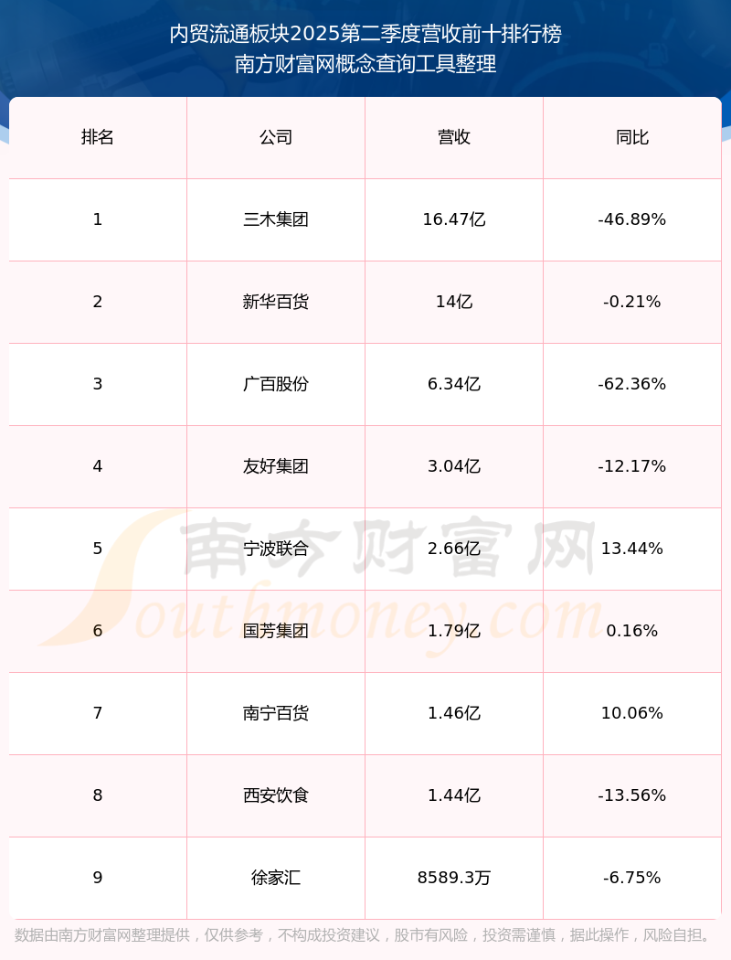 按照南方財(cái)富網(wǎng)概念查詢工具統(tǒng)計(jì),該股所屬板塊為內(nèi)貿(mào)流通板塊,該板塊共有9只股票,東方創(chuàng)業(yè)2025第二季度營(yíng)收在該板塊中排名為第9名,該板塊2025第二季度營(yíng)收排名前十的股票如下表: