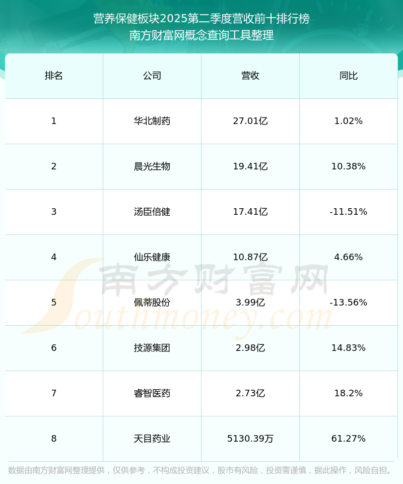 按照南方財(cái)富網(wǎng)概念查詢工具統(tǒng)計(jì),該股所屬板塊為營(yíng)養(yǎng)保健板塊,該板塊共有8只股票,技源集團(tuán)2025第二季度營(yíng)收在該板塊中排名為第6名,該板塊2025第二季度營(yíng)收排名前十的股票如下表: