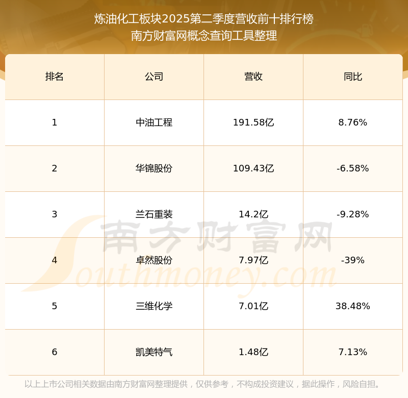 按照南方財(cái)富網(wǎng)概念查詢工具統(tǒng)計(jì),該股所屬板塊為煉油化工板塊,該板塊共有6只股票,中國(guó)石油2025第二季度營(yíng)收在該板塊中排名為第6名,該板塊2025第二季度營(yíng)收排名前十的股票如下表: