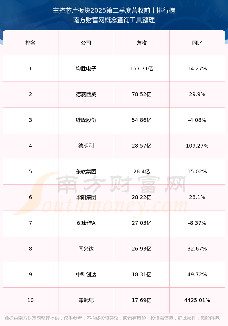 按照南方財富網(wǎng)概念查詢工具統(tǒng)計,該股所屬板塊為主控芯片板塊,該板塊共有28只股票,峰岹科技2025第二季度營收在該板塊中排名為第28名,該板塊2025第二季度營收排名前十的股票如下表: