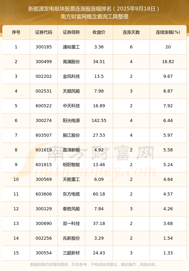 2025年9月18日新能源發(fā)電板塊股票連漲股漲幅排名