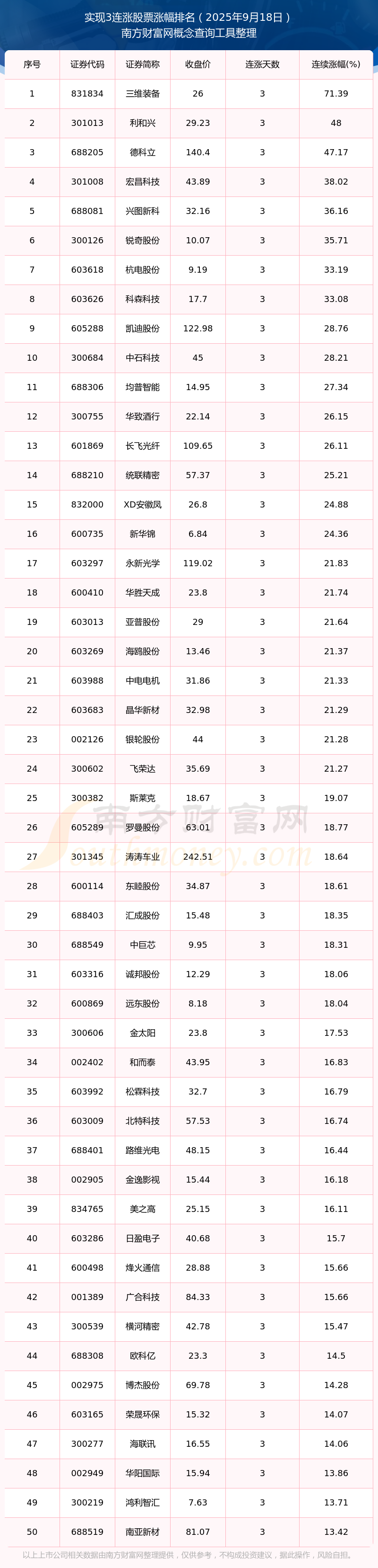 根據(jù)南方財(cái)富網(wǎng)概念查詢工具數(shù)據(jù)統(tǒng)計(jì),截止2025年9月18日收盤,共有234只個(gè)股實(shí)現(xiàn)3天連漲。其中連續(xù)漲幅較大的個(gè)股有三維裝備、利和興、德科立等,連續(xù)漲幅分別為71.39%、48.00%、47.17%。