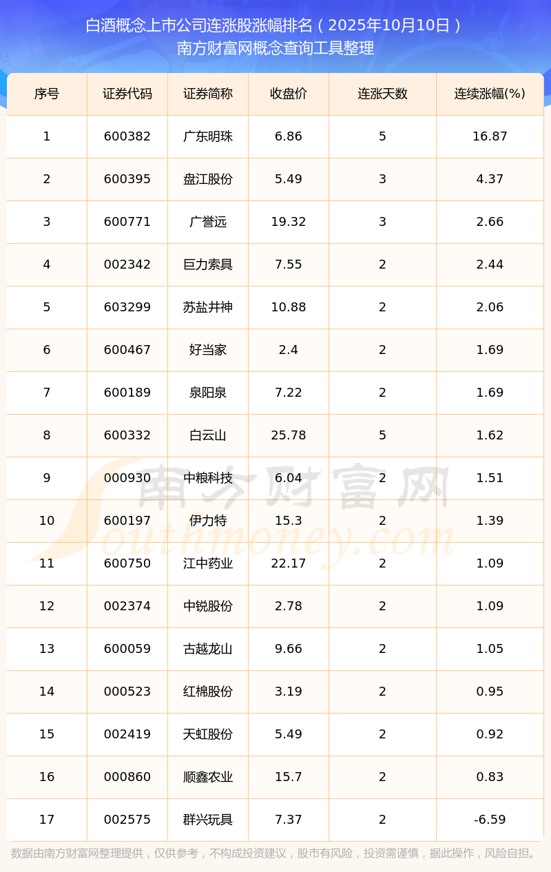 2025年10月10日白酒概念上市公司連漲股漲幅排名
