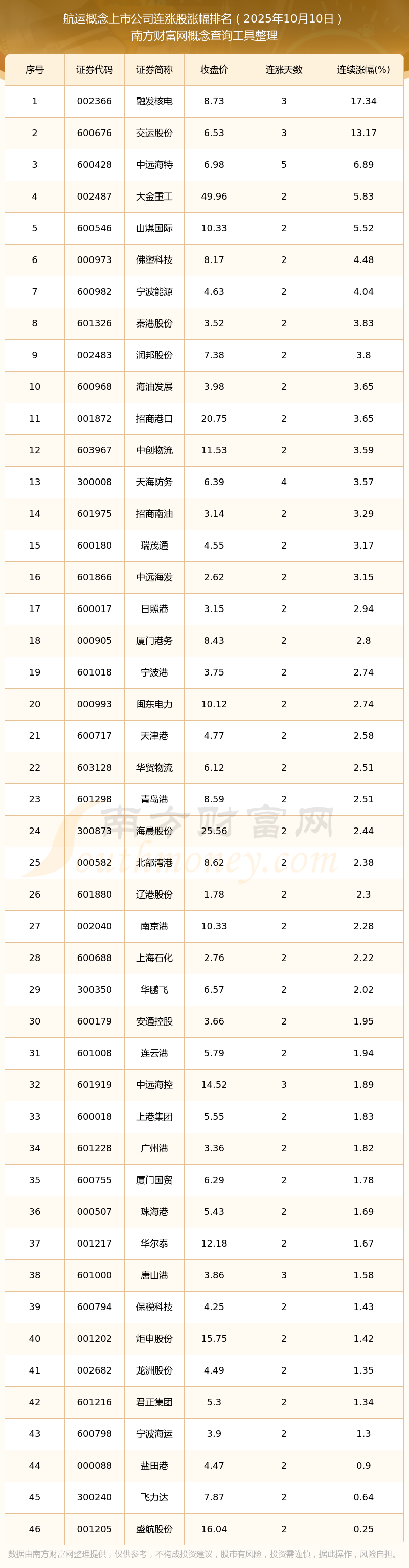 2025年10月10日航運(yùn)概念上市公司連漲股漲幅排名