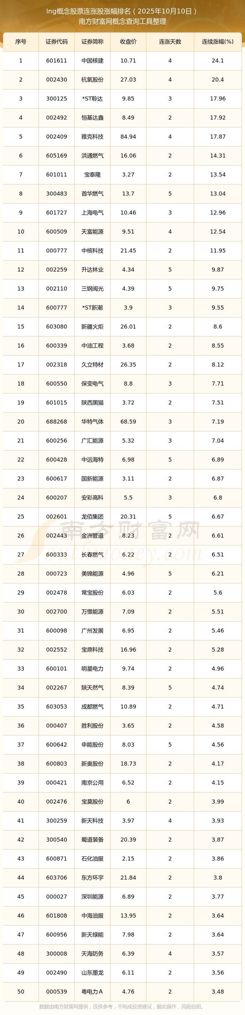 根據(jù)南方財富網(wǎng)概念查詢工具數(shù)據(jù)統(tǒng)計,截止2025年10月10日收盤,lng概念股票共有74只個股實現(xiàn)連漲。其中連續(xù)漲幅較大的個股有中國核建、杭氧股份、*ST聆達等,連續(xù)漲幅分別為24.10%、20.40%、17.96%。