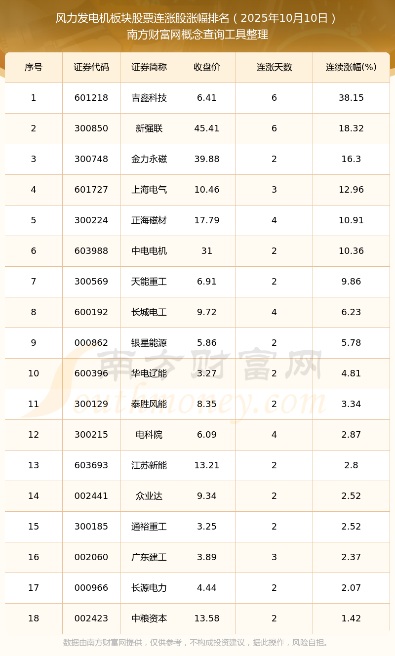 2025年10月10日風(fēng)力發(fā)電機(jī)板塊股票連漲股漲幅排名