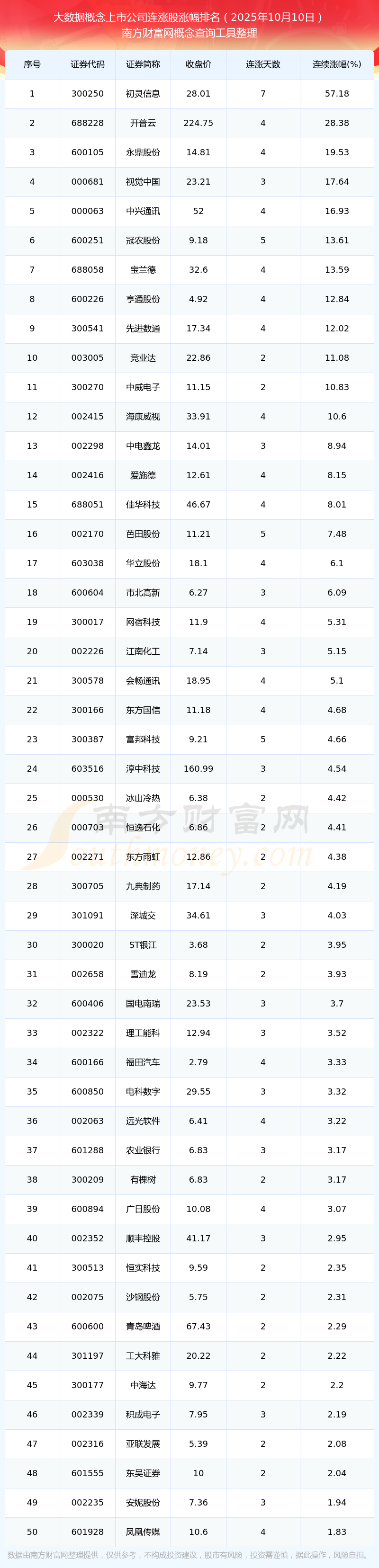 2025年10月10日大數(shù)據(jù)概念上市公司連漲股漲幅排名
