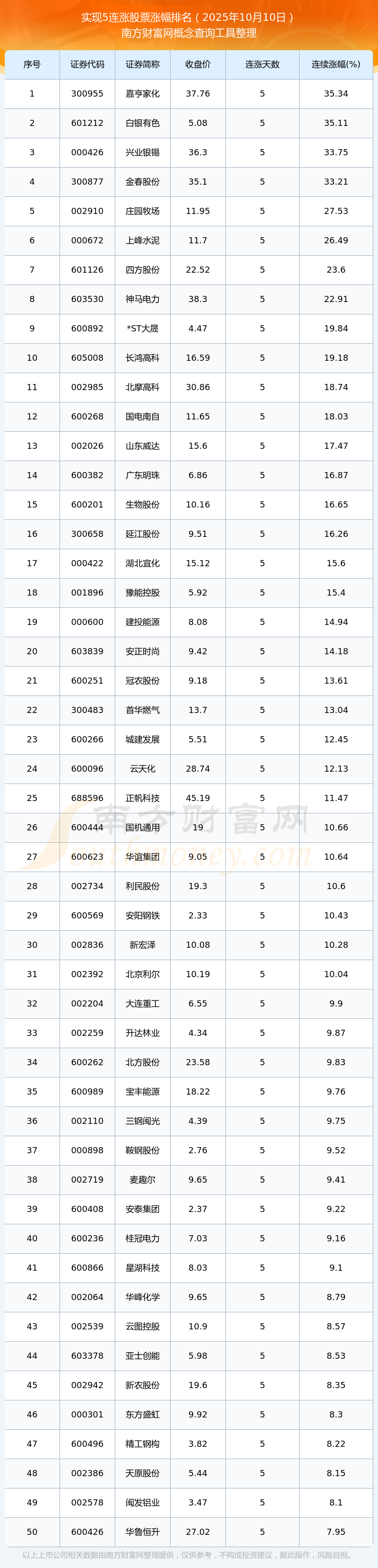 根據(jù)南方財富網(wǎng)概念查詢工具數(shù)據(jù)統(tǒng)計,截止2025年10月10日收盤,共有116只個股實現(xiàn)5天連漲。其中連續(xù)漲幅較大的個股有嘉亨家化、白銀有色、興業(yè)銀錫等,連續(xù)漲幅分別為35.34%、35.11%、33.75%。