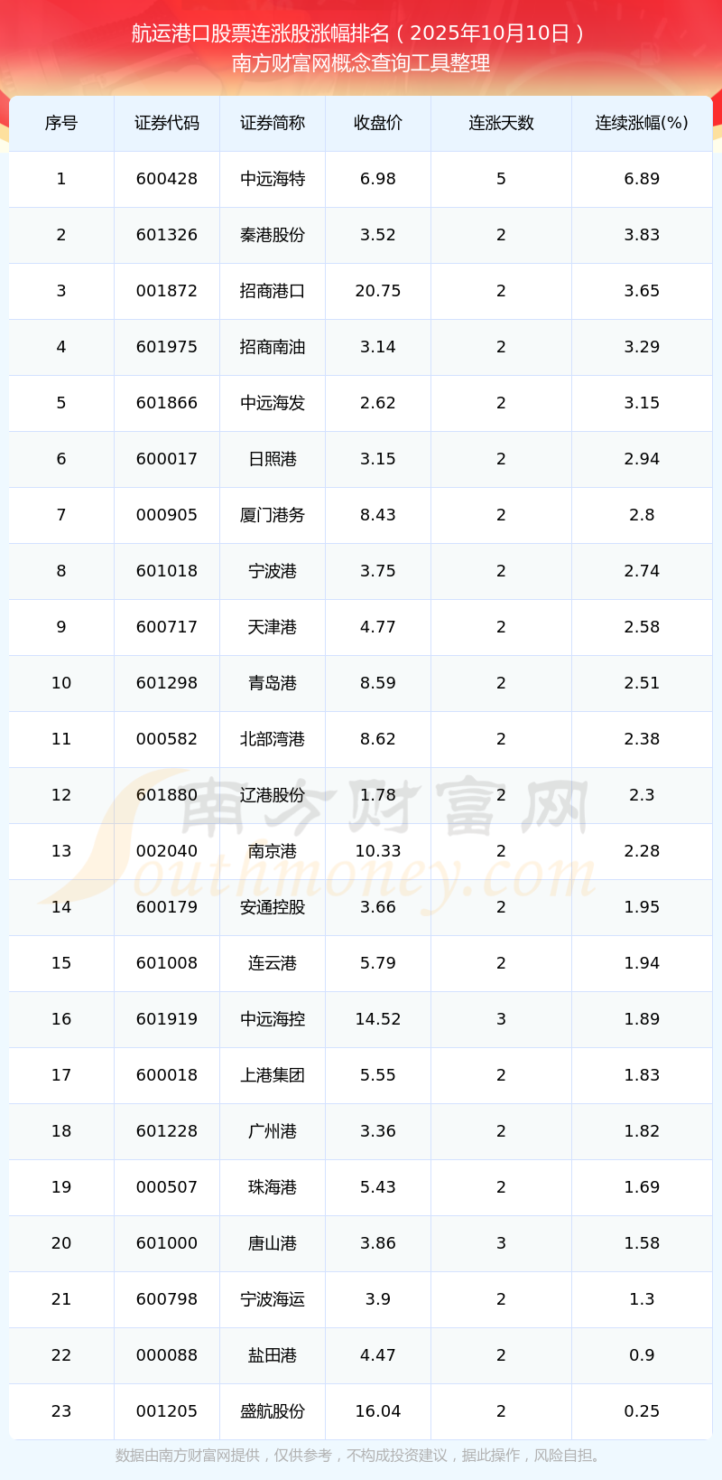 根據(jù)南方財(cái)富網(wǎng)概念查詢工具數(shù)據(jù)統(tǒng)計(jì),截止2025年10月10日收盤,航運(yùn)港口股票共有23只個(gè)股實(shí)現(xiàn)連漲。其中連續(xù)漲幅較大的個(gè)股有中遠(yuǎn)海特、秦港股份、招商港口等,連續(xù)漲幅分別為6.89%、3.83%、3.65%。