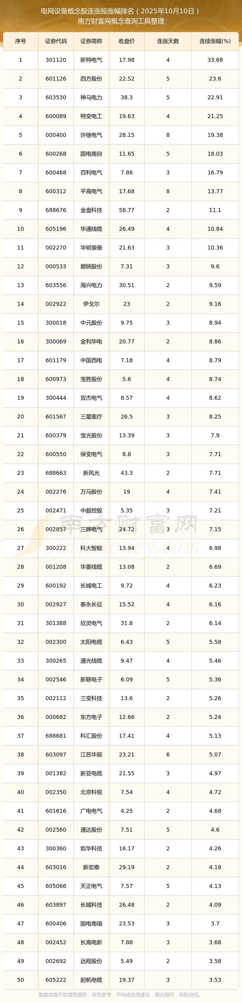 2025年10月10日電網(wǎng)設(shè)備概念股連漲股票漲幅排名