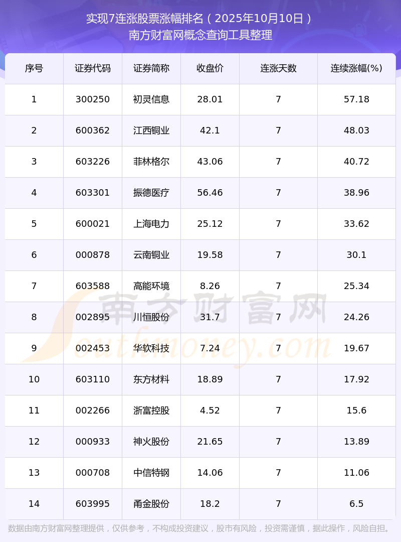 根據(jù)南方財(cái)富網(wǎng)概念查詢工具數(shù)據(jù)統(tǒng)計(jì),截止2025年10月10日收盤(pán),共有14只個(gè)股實(shí)現(xiàn)7天連漲。其中連續(xù)漲幅較大的個(gè)股有初靈信息、江西銅業(yè)、菲林格爾等,連續(xù)漲幅分別為57.18%、48.03%、40.72%。