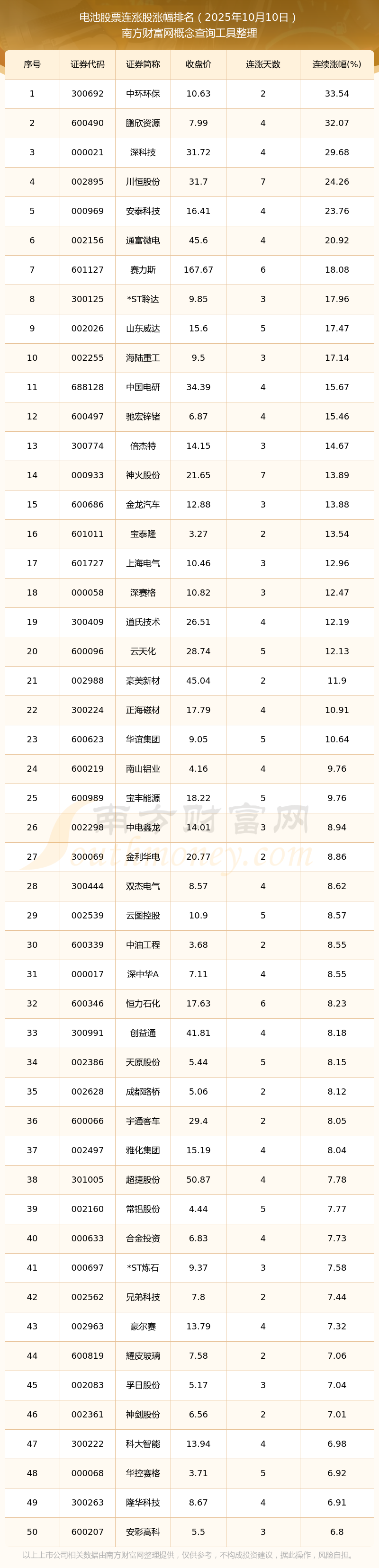 根據(jù)南方財(cái)富網(wǎng)概念查詢工具數(shù)據(jù)統(tǒng)計(jì),截止2025年10月10日收盤,電池股票共有159只個(gè)股實(shí)現(xiàn)連漲。其中連續(xù)漲幅較大的個(gè)股有中環(huán)環(huán)保、鵬欣資源、深科技等,連續(xù)漲幅分別為33.54%、32.07%、29.68%。