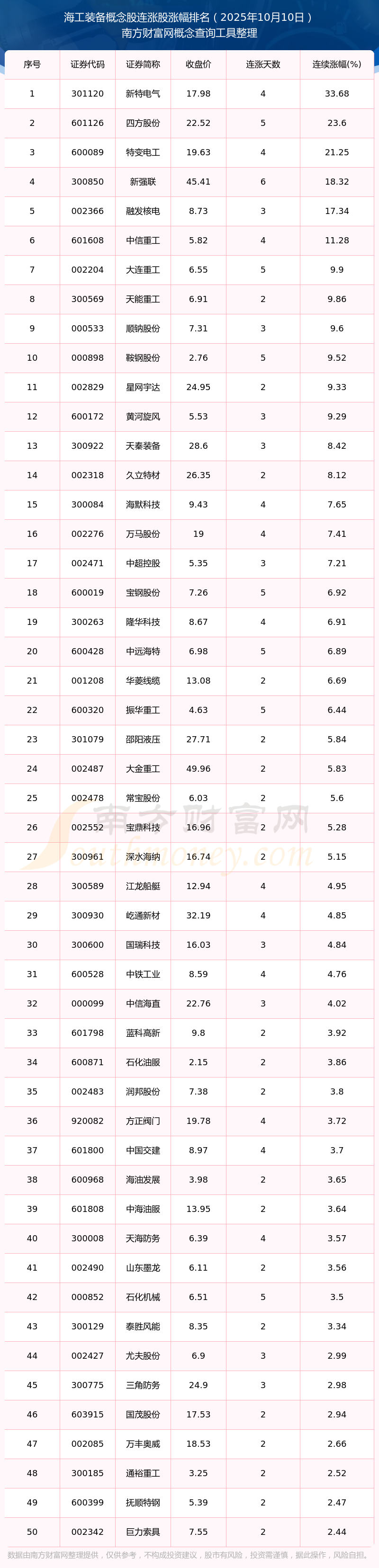根據(jù)南方財富網(wǎng)概念查詢工具數(shù)據(jù)統(tǒng)計,截止2025年10月10日收盤,海工裝備概念股共有63只個股實現(xiàn)連漲。其中連續(xù)漲幅較大的個股有新特電氣、四方股份、特變電工等,連續(xù)漲幅分別為33.68%、23.60%、21.25%。