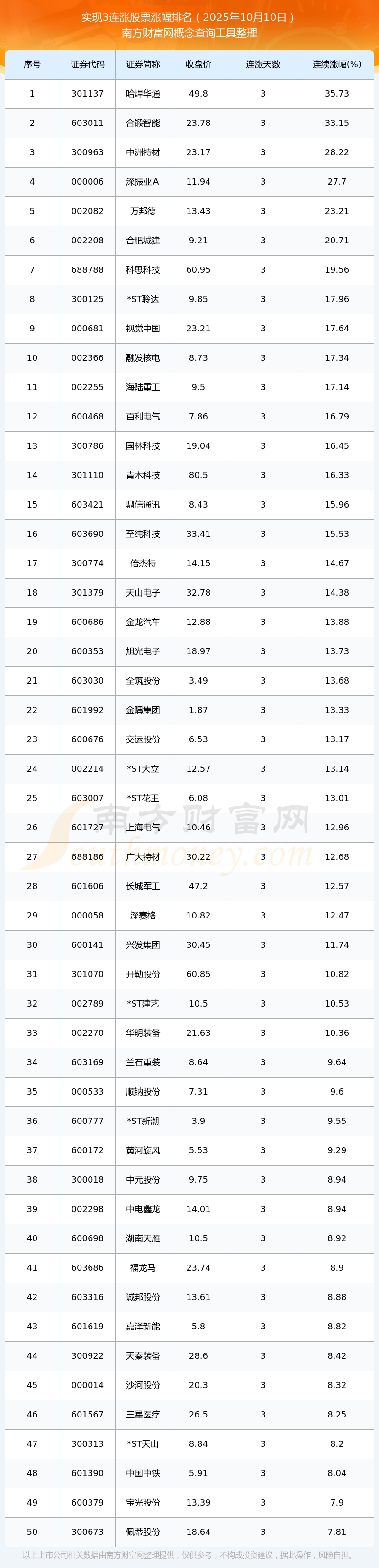 2025年10月10日實現(xiàn)3連漲股票漲幅排名