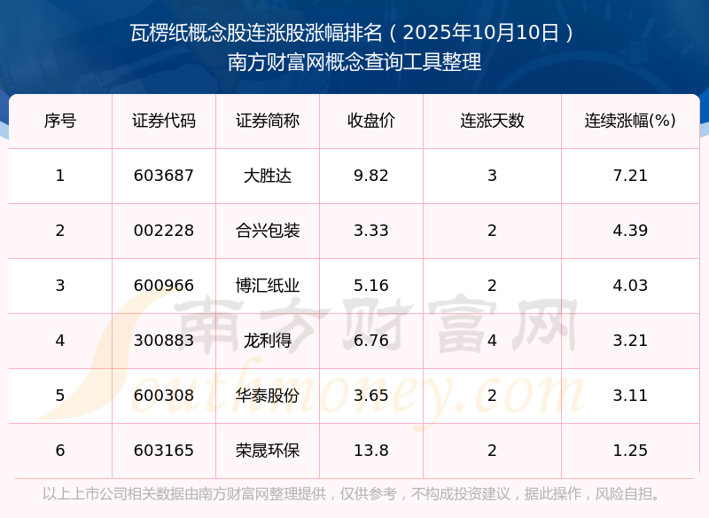 2025年10月10日瓦楞紙概念股連漲股漲幅排名