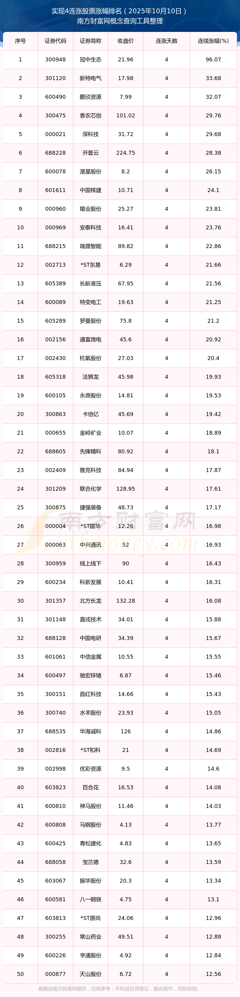 2025年10月10日實(shí)現(xiàn)4連漲股票漲幅排名