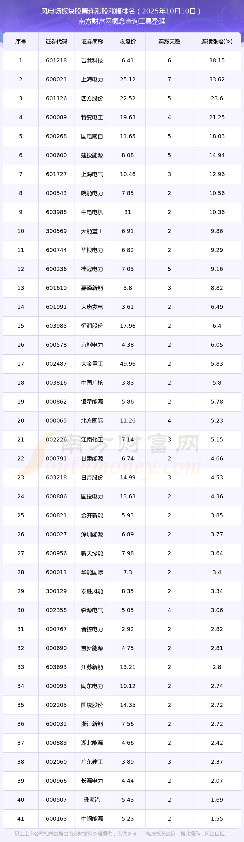 2025年10月10日風(fēng)電場(chǎng)板塊股票連漲股漲幅排名